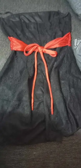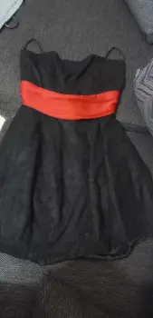 Hermoso vestido negro de encaje. Vestido corto de encaje, con forro, listón de satin rojo dijo al frente atrás suelto para anudarse, cierre oculto trasero