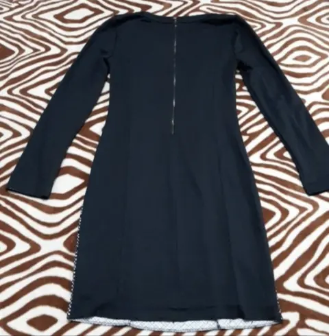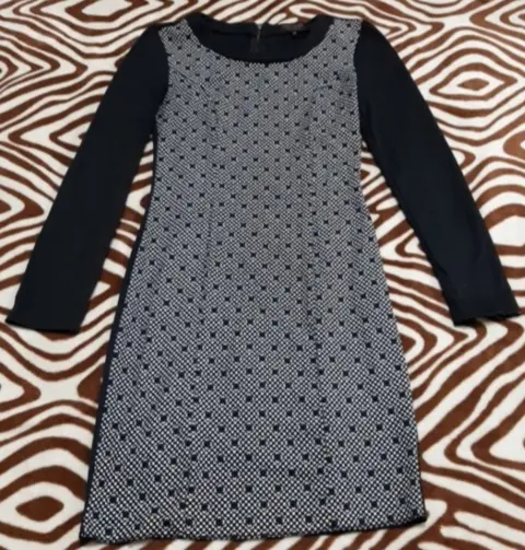 Vestido negro con blanco talla M estira, largo hasta la rodilla, zipper en la espalda