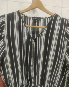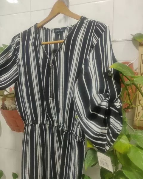 Hermoso vestido nuevo de rayas negras y blancas, verticales por lo que ayuda a la figura.Súper padre! Con cierre al frente y elástico en la cintura.