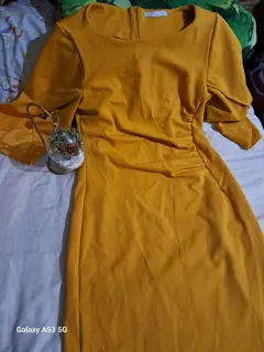 Hermoso vestido para fiesta o casual. Talla Grande, color mostaza, manga tres cuartos, un poco acampando, muy bonita y fresca