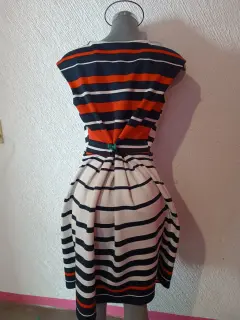 Hermoso vestido talla G. Hermoso vestido blanco con rallas azul marino y rojo. En exelentes condiciones queda a una talla 34 o 36. ❤️