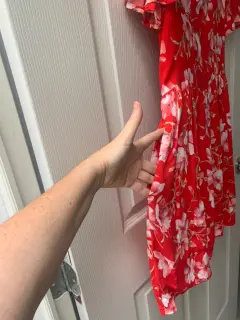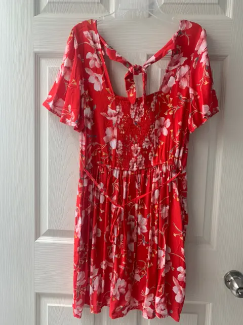 Bonito vestido fresco de tela estampada. Con bello escote. Bolsas ambos lados de la falda. Con tirante ajustable en la cintura. Espalda luce bella por la tela ajustada. Nuevecito. Sin estrenar.