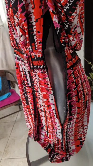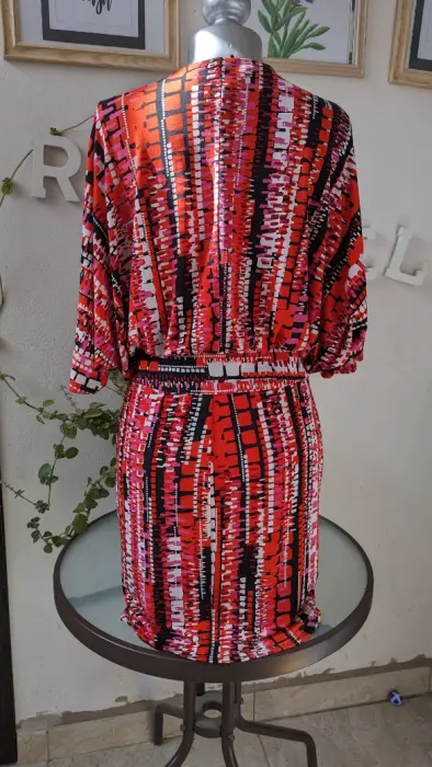 Laundry by shelli segal vestido. Este vestido Laundry by Shelli Segal es imprescindible para cualquier armario. El vestido presenta escote en V, mangas raglán y cierre de jersey. Está hecho de 93% rayón y 7% spandex, lo que proporciona un ajuste cómodo y elástico. El vestido llega hasta la rodilla y tiene un diseño multicolor, perfecto para añadir un poco de color a tu armario. Talla L
