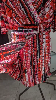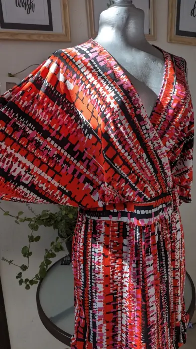 Este vestido Laundry by Shelli Segal es imprescindible para cualquier armario. El vestido presenta escote en V, mangas raglán y cierre de jersey. Está hecho de 93% rayón y 7% spandex, lo que proporciona un ajuste cómodo y elástico. El vestido llega hasta la rodilla y tiene un diseño multicolor, perfecto para añadir un poco de color a tu armario. Talla L