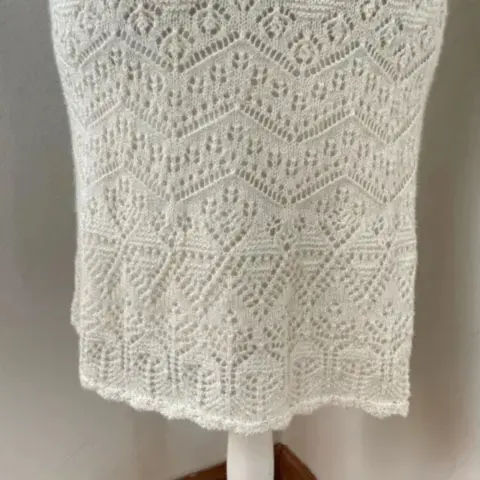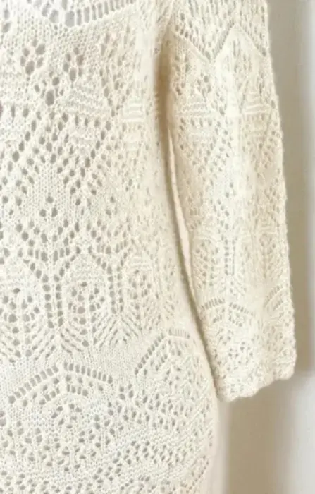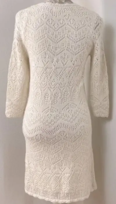 Lindisimo vestido en croche. Totalmente forrado en algodo, cuello redondo y mangas 3/4. 46 cm., de axila a axila y 85 cm., de largo total.