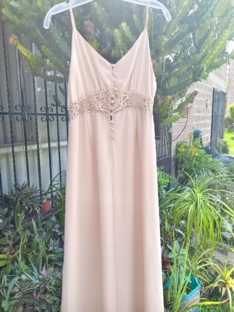 Lindo vestido. Lindo vestido de tirantes con aplicaciones encaje en cintura, colo baige, talla grande