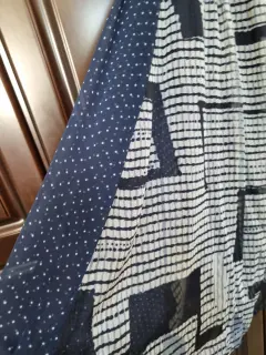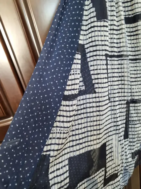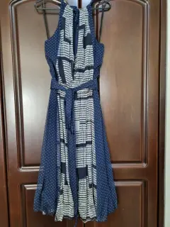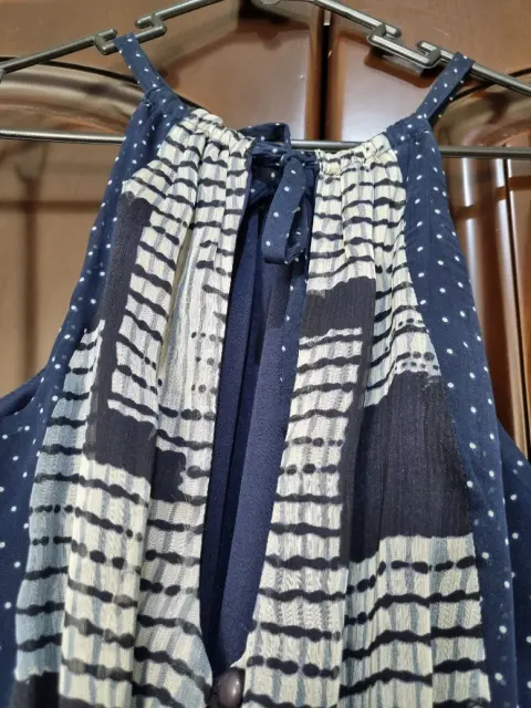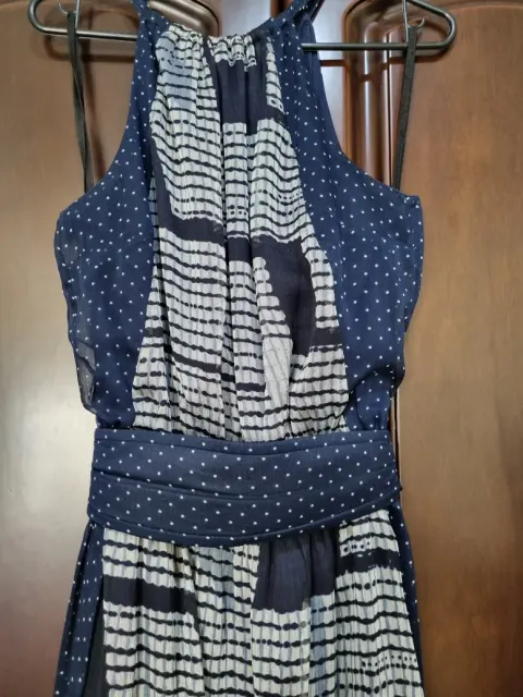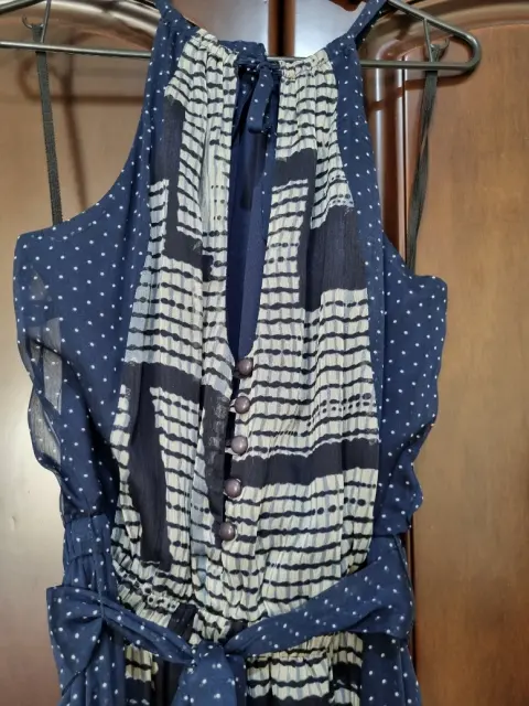 Vestido tipo halter ajustable, color azul Marino con beige estampado midi, talla chica con forro