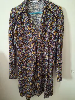 Lindo vestido corto. Lindo vestido ideal jovenes, algo formal tipo camisero. Con discretos detalles en cinta negra coryo y con delicadas y pequeñas flores en tela, ideal para algo formal