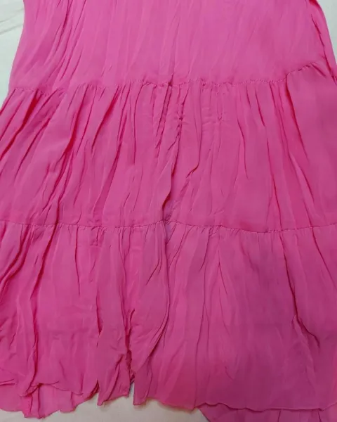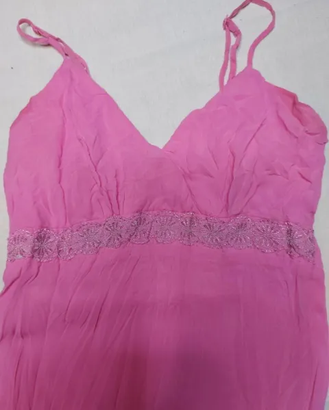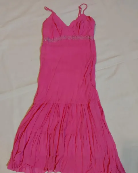 Lindo vestido rosa con un adorno abajo del pecho color entre dorado y plateado, es de tirantes ajustables se ajusta al cuerpo y hace linda figura.