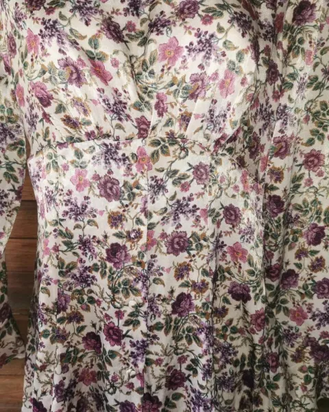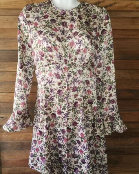 Lindo vestido floreado tela tipo seda, ajusta al cuerpo tiene botones en la parte de la falda.Le falta el boton de la parte de atrás del cuello.
