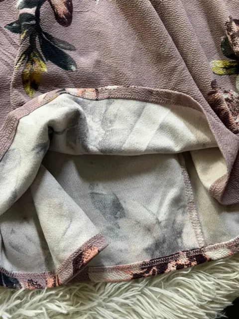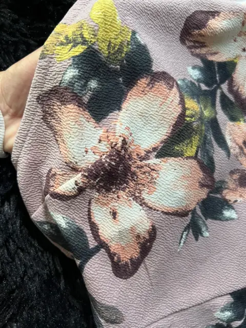 En tono lila , floreado Lindo corte da bonita forma Talla medianaNo se transparenta Sin detalles