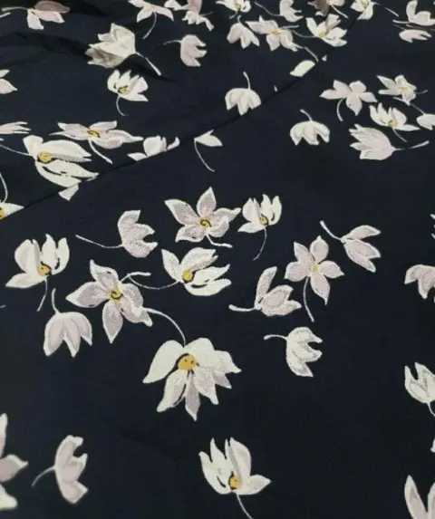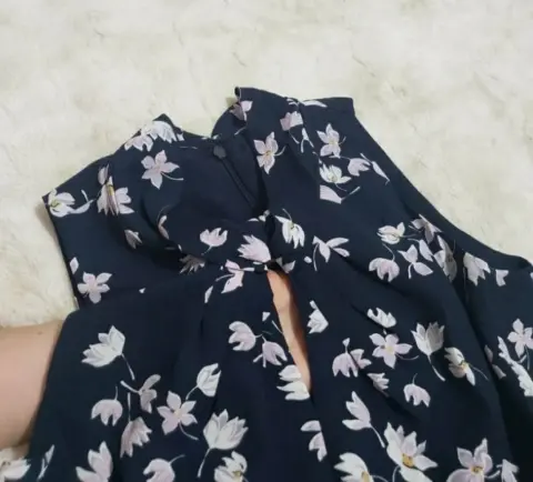 Hermoso vestido estampado floral, color azul marino y flores lilas tipo jacarandas, muy fresco, cuello halter, y abertura en escote, cierre trasero, Medidas: axila a axila 42cm, cintura 37cm, largo 87cm. La etiqueta dice talla 0