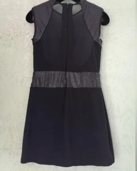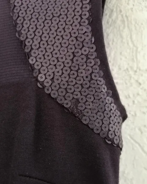 Vestido de fiesta color negro, tela stretch, corto, con lentejuelas, sin mangas, con transparencias en el escote y la espalda. Con un detalle en foto 5. Talla 1. Perfecto para salir de fiesta o a cenar.