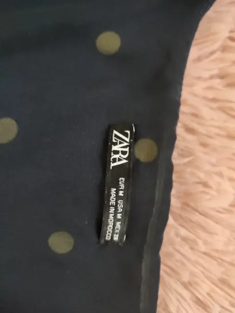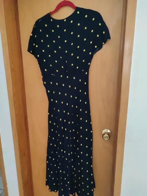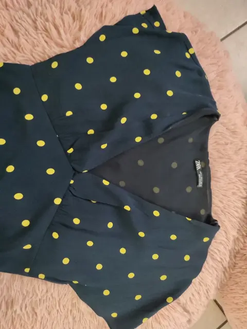 Lunares amarillos con azul marino. Vestido largo tipo A, tela suave, divertido diseño, escote en V pronunciado el cierre es lateral