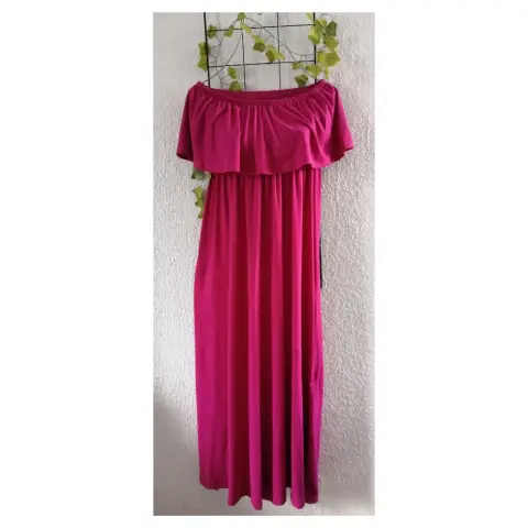 Maxi vestido straple com planes, unitalla, trae una pequeña abertura en la pierna, hermoso tela brush color Bugambilia