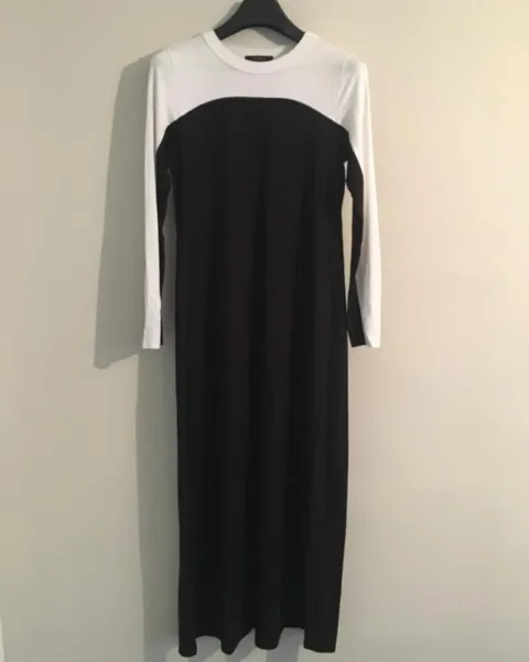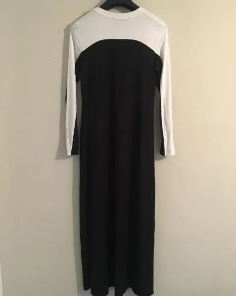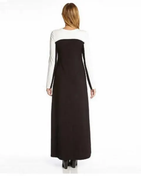 Maxi vestido bicolor, manga larga y cuello redondo . Tela tipo licra. Medidas: ancho 52 cm Largo 1.45 cm