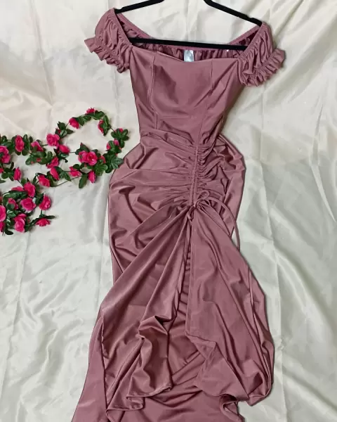Lindo maxi vestido color rosa bb o champagne VESTIDO CORTE SIRENA FRUNCIDO AL FRENTE CON HOMBROS DESCUBIERTOCon abertura de lado derecho que llega a media pierna, tela con strech que se ajusta al cuerpo Talla S/M