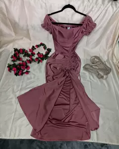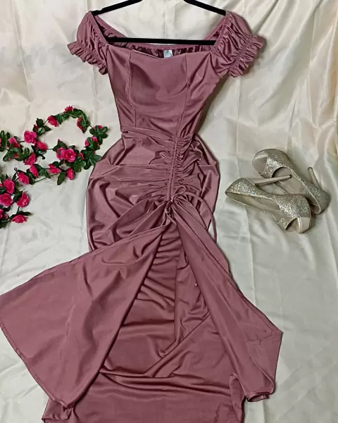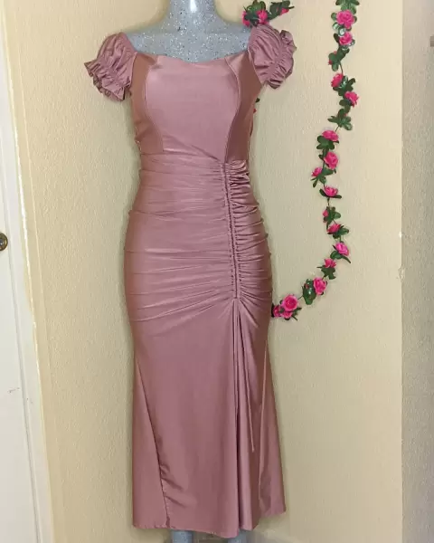 Maxi vestido. Lindo maxi vestido color rosa bb o champagne VESTIDO CORTE SIRENA FRUNCIDO AL FRENTE CON HOMBROS DESCUBIERTOCon abertura de lado derecho que llega a media pierna, tela con strech que se ajusta al cuerpo Talla S/M