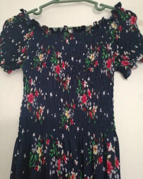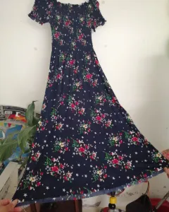 Maxi vestido azul marino con flores , resorte en la parte de la cintura y cuello tipo campesino, se puede bajar para lucir los hombros..Tiene el detalle en la bastilla se le cortó pero no sé nota