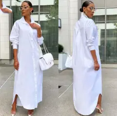 Maxi vestido camisero. Maxi vestido camisero blanco, elegante y fresco, botones de concha nacar, a estrenar sin detalles es talla M pero también queda en talla L, la avertura de la pierna llega hasta la rodilla, lo puedes usar como ensamble o con un lindo cinto, se ve muy sexy.Medidas:Axila a axila 61 cmHombro a hombro 55 cmCintura 70 cmLargo 142 cm