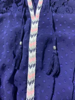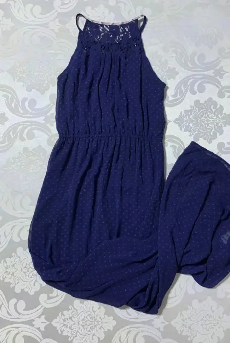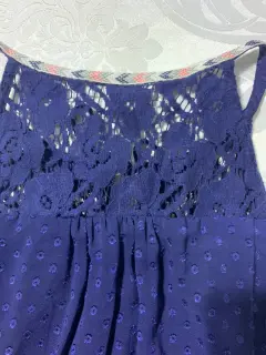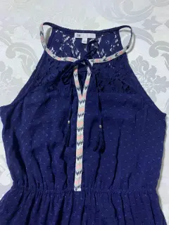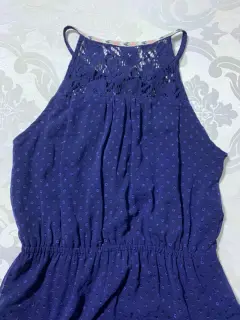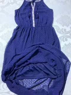 Vestido largo sin mangas, con tirantes al cuello, resorte en la cintura, tela transparente con forro interior corto.Medidas/ busto: 42 cm, cintura: 34 cm, cadera: 54 cm, largo total: 1.50 cm.