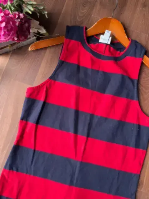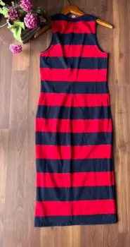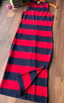 Precioso maxi vestido de rayas , color azul con rojo , tiene una abertura de lado . Estira , puede quedar a talla S, ideal para usar con tenis