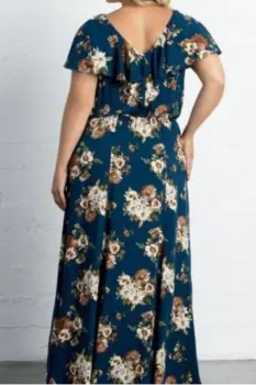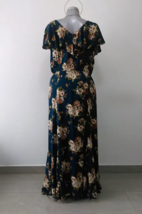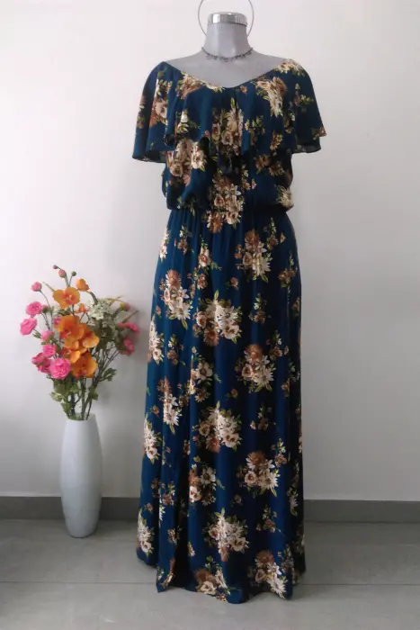Hermoso vestido azul con floraciones en tonos beige y café. Con diseño con volantes en hombros o tipo campesino.Con cintura elástica y maxifalda amplia con pequeña abertura baja.Con forroTela suave strech 98% poliéster y 2% spandex.Marca KiyonnaTalla 3XL(40/42)Pecho 140 cmAxila/axila 70 cmCintura 100-140 cmCadera 150 cmLargo desde hombros 155 cmVestido en perfecto estado ¡Como nuevo!. Sin detalles. Se envía listo para su uso lavado y/o con tintorería de acuerdo a las indicaciones de su etiqueta.Listo para envió el mismo día de tu compra o día siguiente.