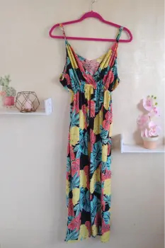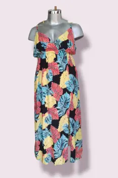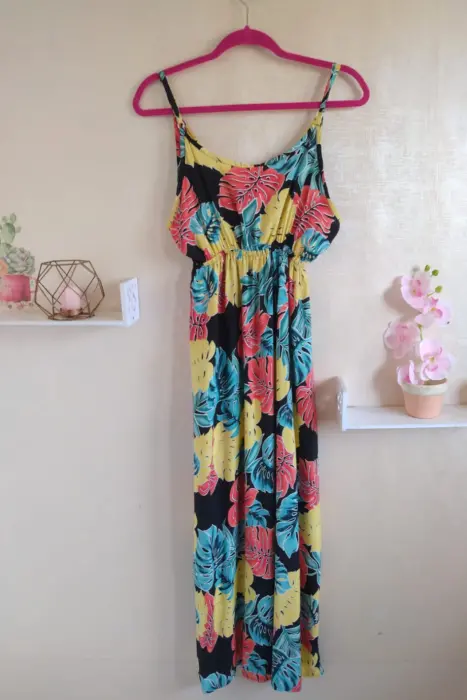Maxivestido estampadoTirantesAbertura en pierna de la rodilla hacia abajoTela súper frescaMedidas:Axila a axila: 48 sin estirar. Estira hasta 62cm por el frente /68cm por detrasResorte del talle: 30/50cmLargo: 135cm