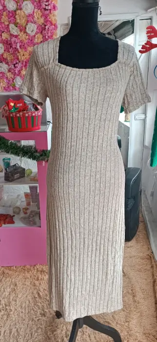 MAXIVESTIDO, UNITALLA (ESTIRA HASTA XL),COLOR ARENA,,SUAVECITO, TELA TIPO CANELE, MIDE DE HOMBRO A HOMBRO SIN ESTIRAR 41 CM, DE AXILA A AXILA 45 CM, DE LARGO 120 CM, ABERTURA 27 CM
