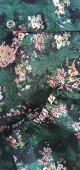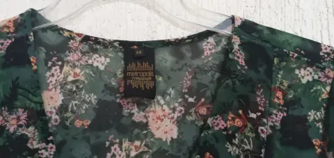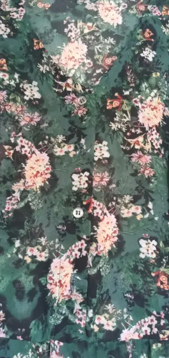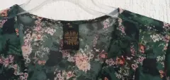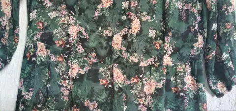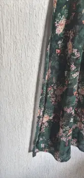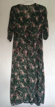 Maxivestido verde con flores. Tela delgada a transparente, requiere un fondo, 4 botones al frente superior, mangas de 42 cm con abertura lateral de 28 cm con elástico a 3/4, 1.35 m de largo con abertura lateral de 56 cm, cintura 38 cm