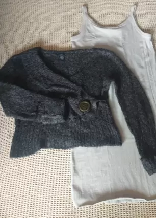 PACK CROP TOP/ VESTIDO GRIS. Pack crop top color negro/con botón grande al frente/diseño en cuello/talla (XL)(hombros.49/axila.52/largo 56/ marca Rue 21Vestido color gris/ talla (L) (axila 45/largo 1.3) Spandex/marca H&M