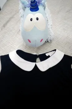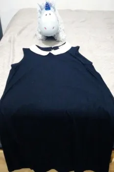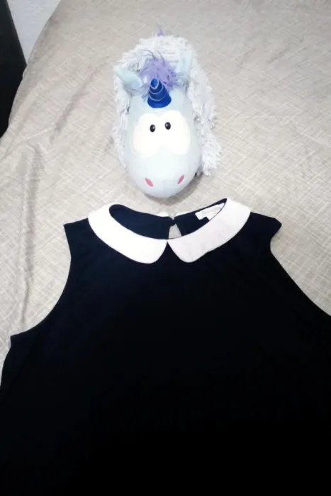 Padrísimo vestido largo color negro, con detalles blanco en el cuello, botón para abrochar en la parte trasera, no es delgado, yo mido 1.65 y me llega poco arriba de las rodillas.Aprovecha la promo, en la compra de esta y otra prenda del mismo precio, te llevas los 2 en $450