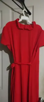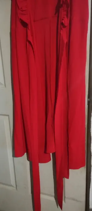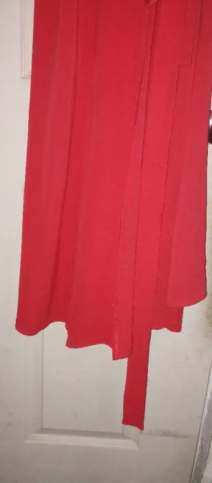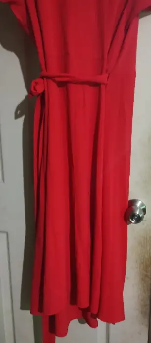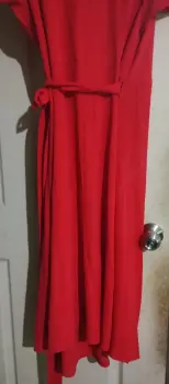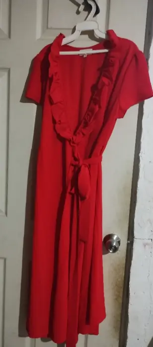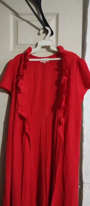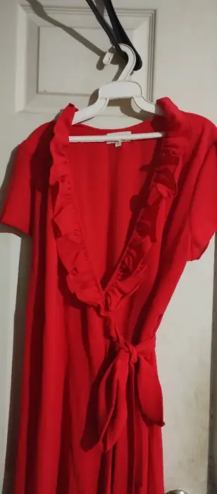 Bello vestido rojo cruzado , con un elegante holán al frente. De larga llega a la pantorrilla y la tela es delgada, por lo que es fresca...