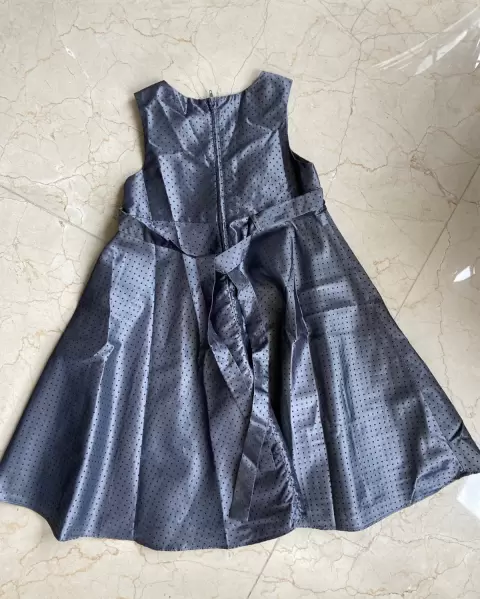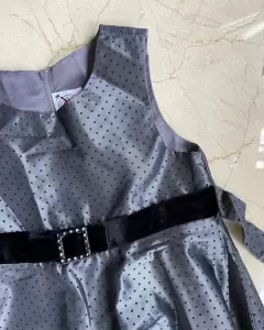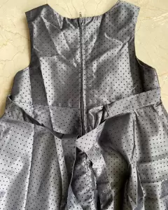 Precioso vestido elegante de fiesta para niña talla 5Tela de Razo plateada con puntitos negrosCon listón para amarrar y moño al frente
