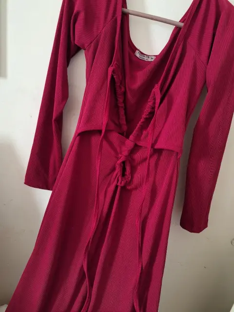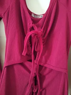 Sexi vestido volor fucia. Com detalles de escote con cintas al frente escote profundo , manga y falda larga, estliza a chicas con busto no muy grande, en tela semi elástica
