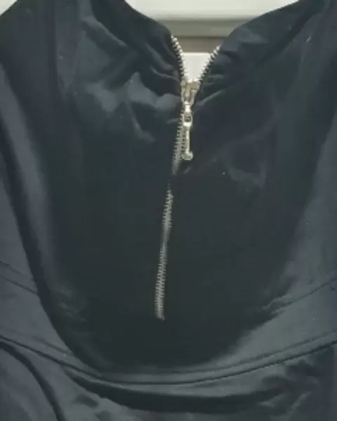 Vesstido negro, strapless, trae un cierre en la parte de enfrente color plata. Cierra por la parte de atrasLlega a la rodilla.