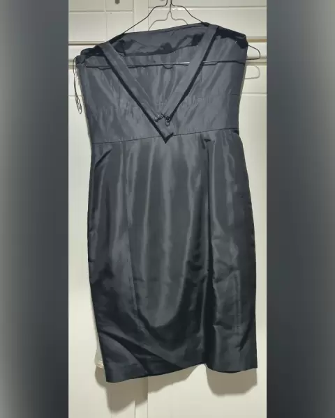 Vwstido zara color negro, se amarra al cuello , con un moño enfrete negro con blanco. Llega a la rodilla
