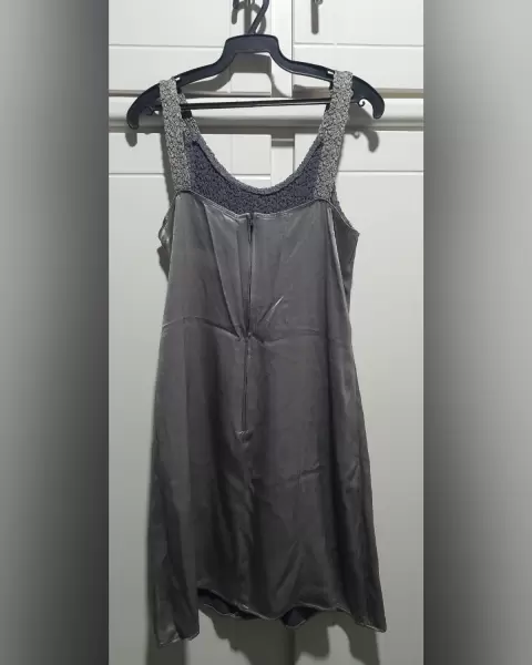 Talla s Vestido satinado gris. Vestido plateado, satinado, corto.Es de tirantes y en la parte del pecho es de ptra tela y es un poco strech.