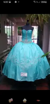 Vestido de XV años marca Mary's importado Nuevo Color Aqua con bordados en hilo plata talla M, incluye crinolina mágica