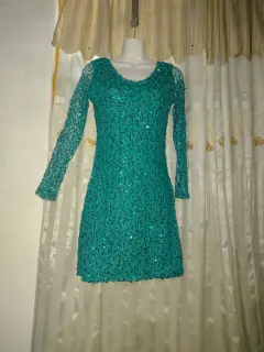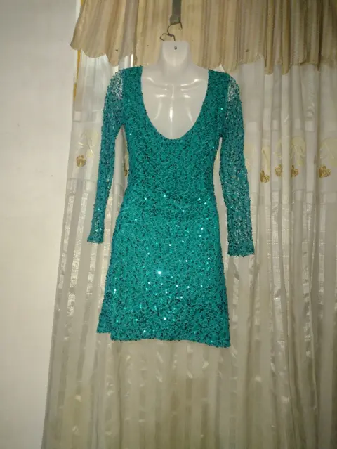 Hermoso vestido verde con lentejuelas escote no muy pronunciado en la espalda y mangas de red se ajusta hermoso al cuerpo es cortito y te deja lucir pierna ideal para todo tipo de evento súper versátil llamativo e interesante.