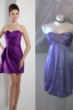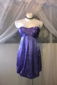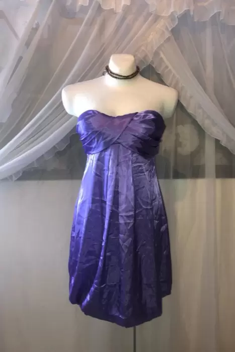 Vestido morado strapless corto, tela tipo satin, con elastico en la espalda, cierre y broche, el color es mas lila que morado intenso, la primera imagen lo representa mejor, el estilo es suelto en corte A.Medidas:Axila a axila: 40 cmcintura: 98 cmlargo: 76 cm de escote a ras de largo