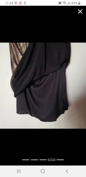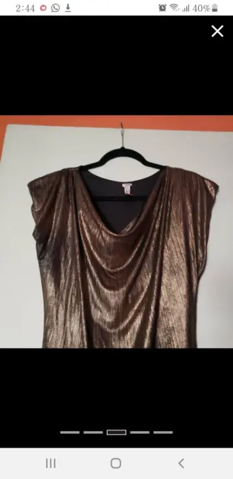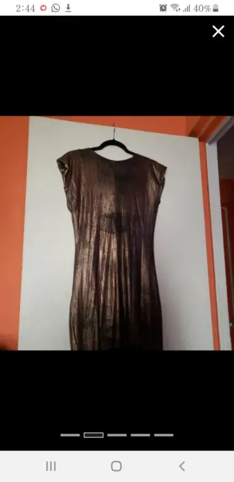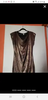 Vestido corto color cobre brilloso, cuenta con fondo debajo, tenia hombreras pero se le retiraron no afecta en diseño, queda arriba de la rodilla, se uso solo una vez. Nota. Lo use estando embarazada 5 meses.