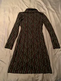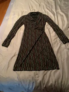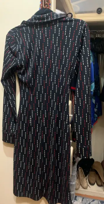Vestido usado muy buenas condiciones talla 3/4 americana (chica) 100% poliéster, alPonérselo se ve una excelente figura por qué horma alCuerpo debido a laForma del vestido.. casual para entretiempo Puedes usarlos con botas y zapato formal.. se ve excelente