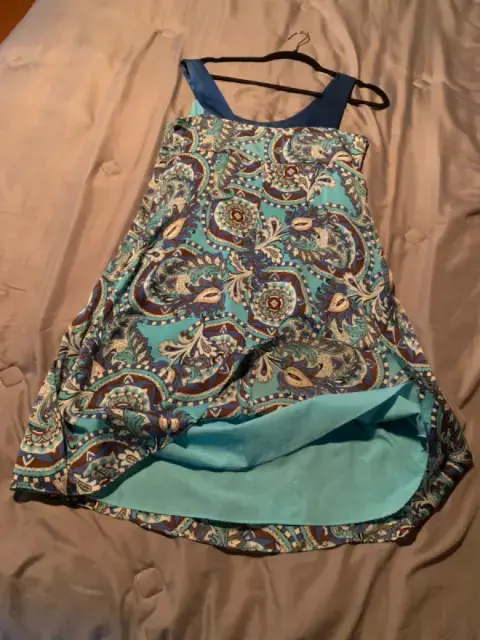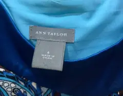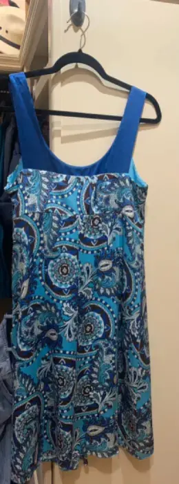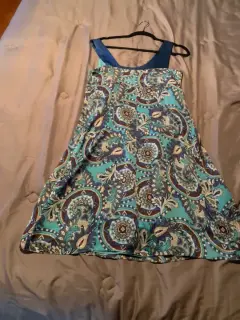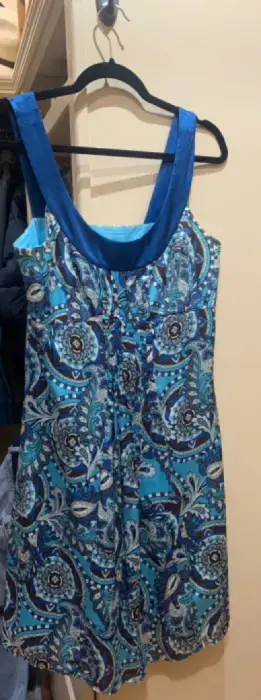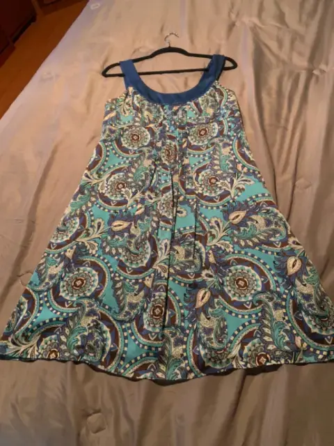 Vestido tonos azul, blanco, café, 100% polyester, corto, talla 6 americano (M) buenas condiciones de segunda mano, excelente para verano, es flojo así es que andas cómoda y además te ves arreglada.