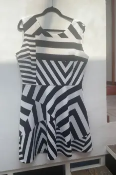 Es un vestido a la rodilla, marca Julio, talla 10, tiene un detalle de mancha pequeña se percibe en las fotos, es una mancha pequeña de maquillaje.El vestido solo tiene dos puestas.
