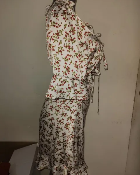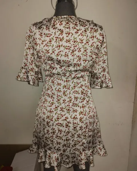 Vestido tipo cocktail.CortoCon holanes en brazos en pecho y en parte inferior.Escote.Es para una talla extra chica o chica pero con poco busto.