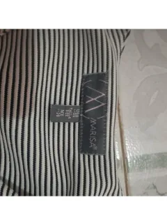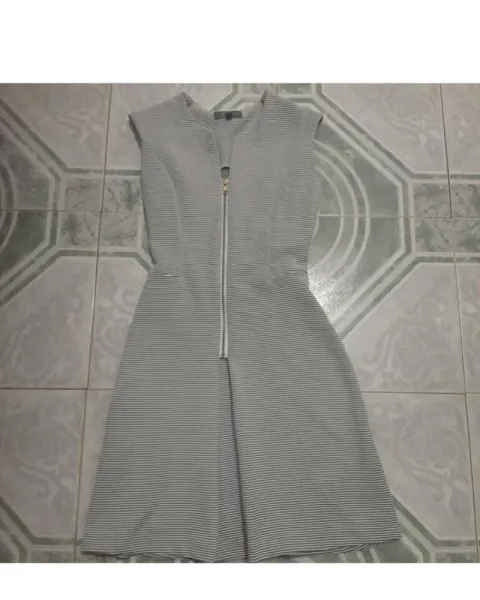 Vestido de rayas negro con blanco, corte amplio de cadera y ajustado en cintura, talla 28, solo tiene una postura.