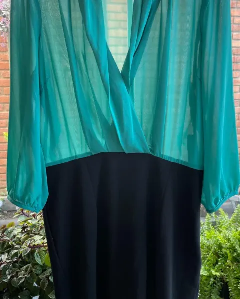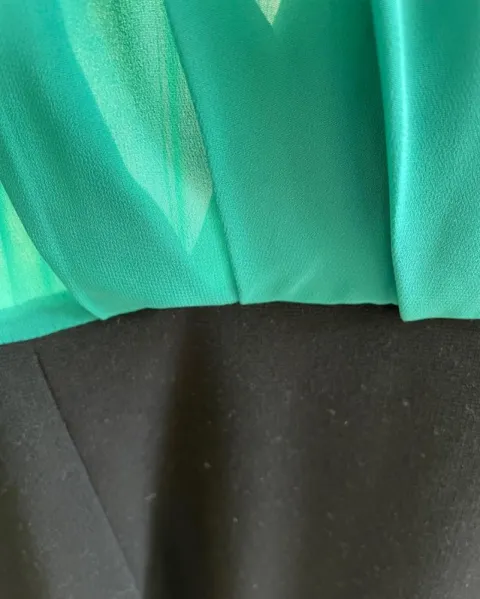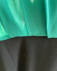 Vestido negro con verde, tela transparente en la parte superior, llega arriba de la rodilla