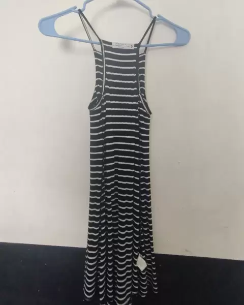 Vestido. Vestido casual, corto de tirantes, con franjas delgadas color blanco y negro. Se ajusta a la figura