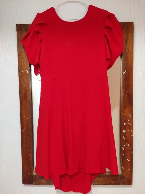Es un vestido rojo pasión totalmente nuevo. Co4don para atar por la parte de atras, escote en la espalda y mangas de farol. Ideal para una cita con la pareja ideal.